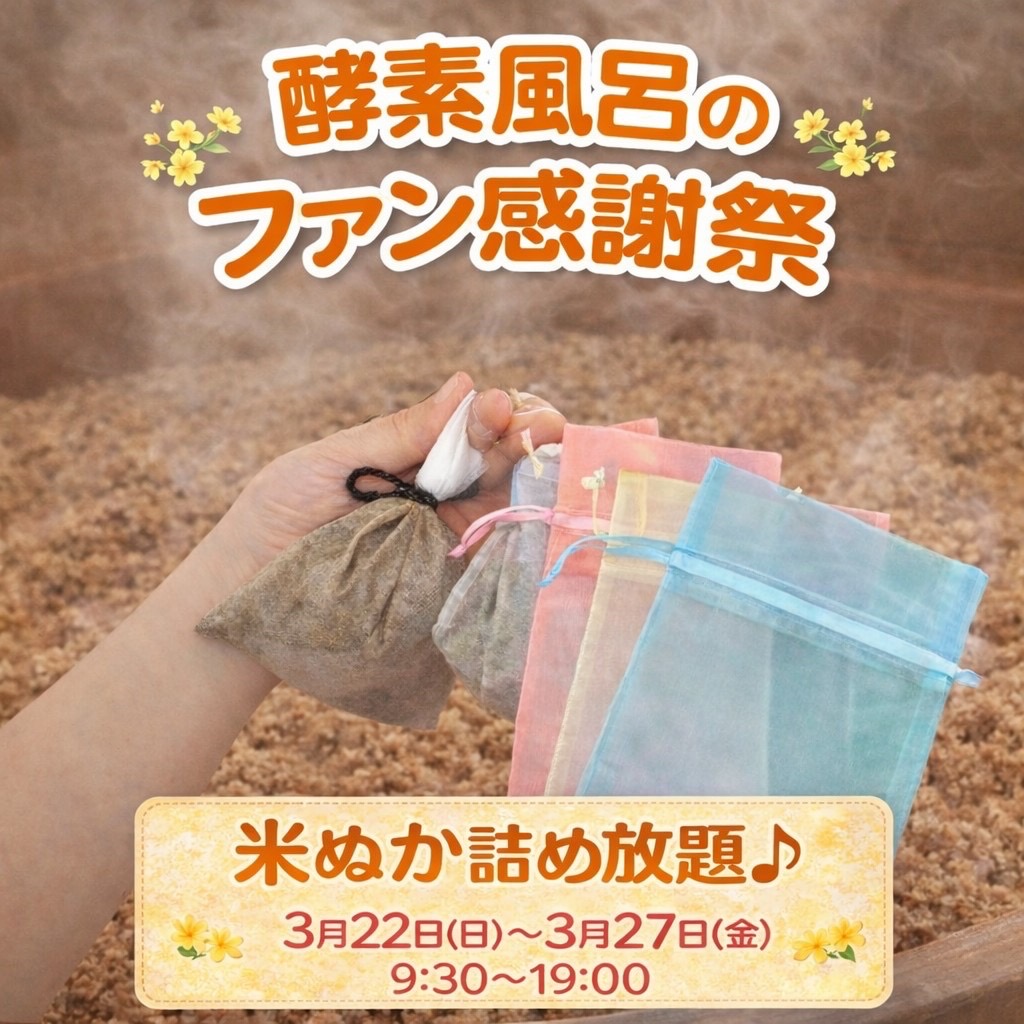 千人町サロンで最後に入っておきたい方、行こうと思ってたのに行きそびれてるな🥹という方、 お待ちしております。 この場所でたくさんのお客様に温まって頂けた事に感謝して、今だけ!お顔の保湿対策3種類からおひとつサービス中です。 もちろん、いつも同じホットアイマスクもあります。 新年度に備えてえスッキリサッパリしましょう♪ Follow me! FacebookXBlueskyHatenaCopy